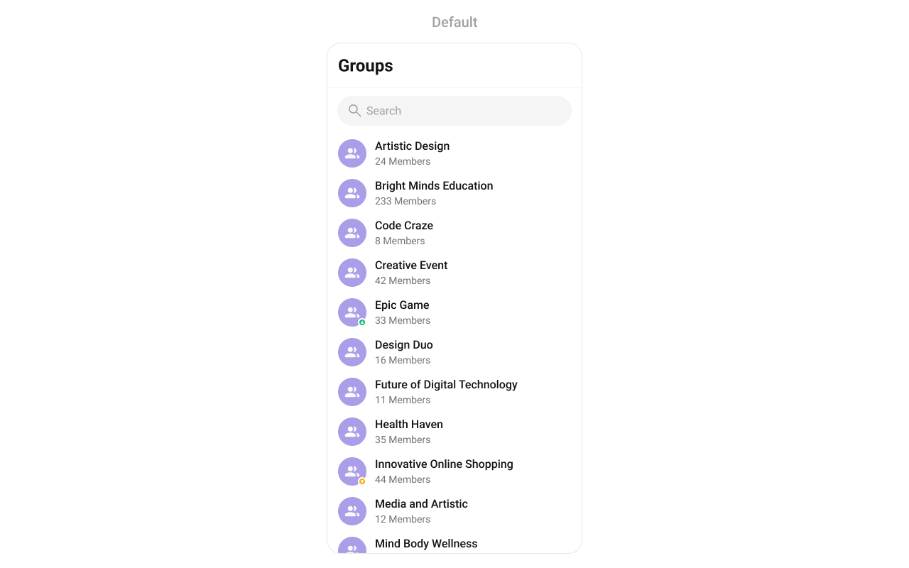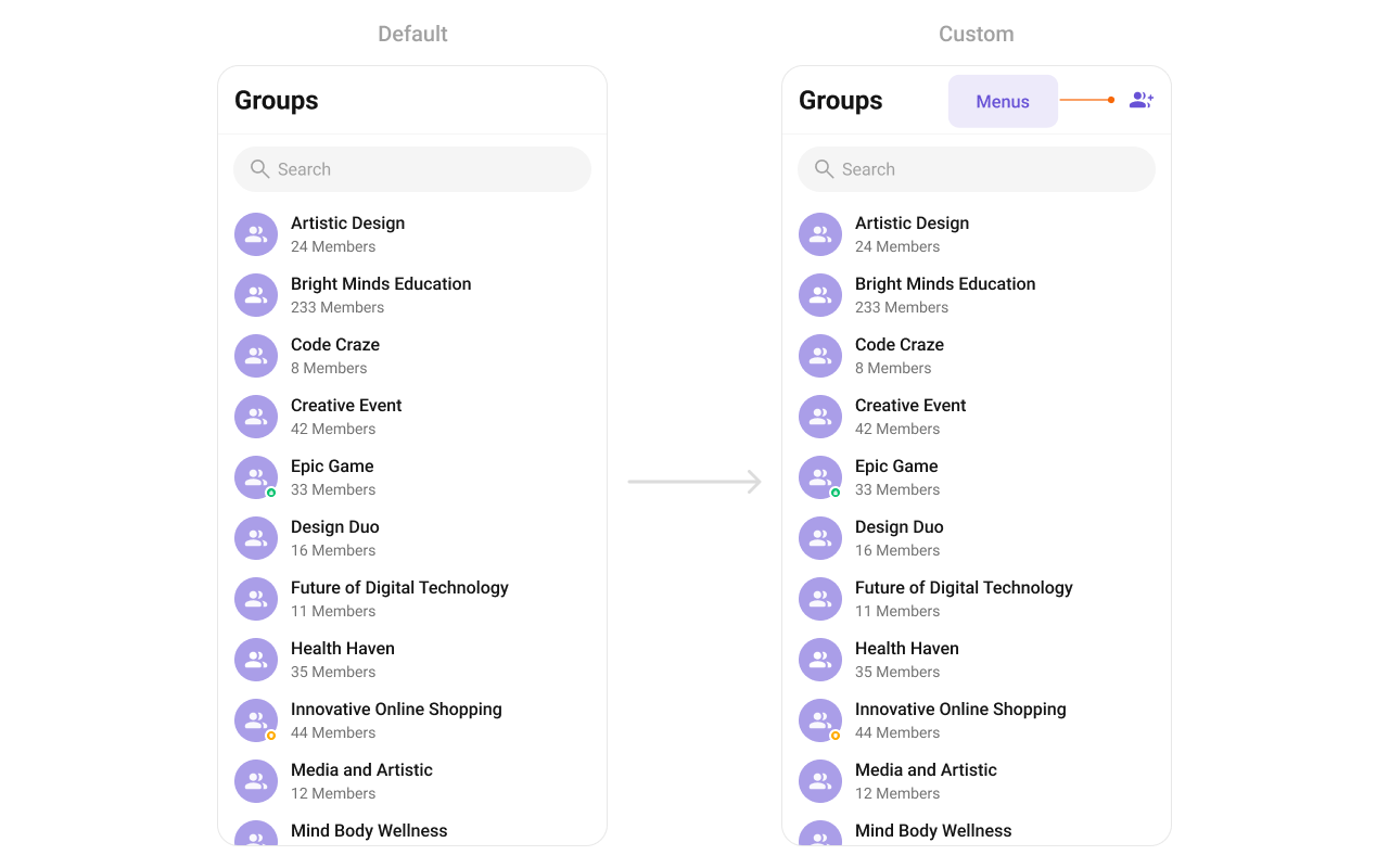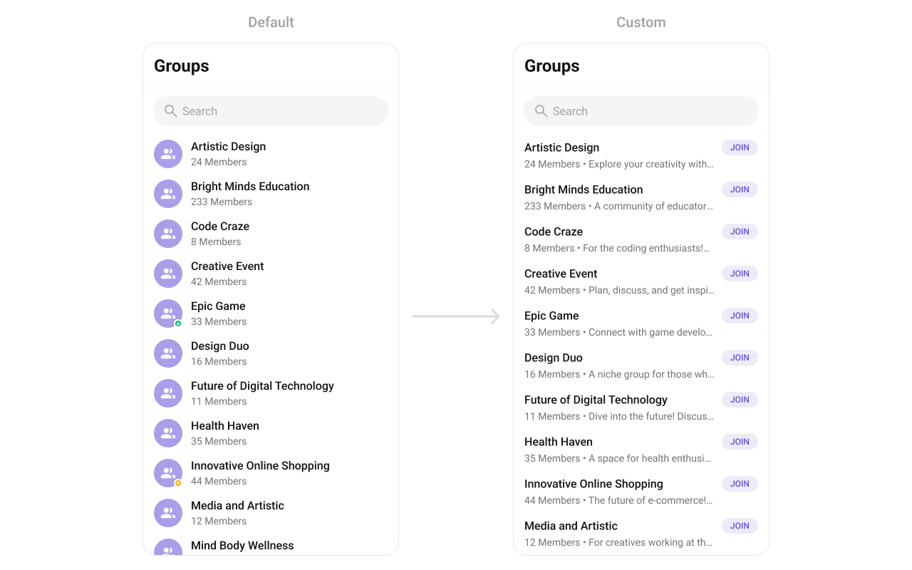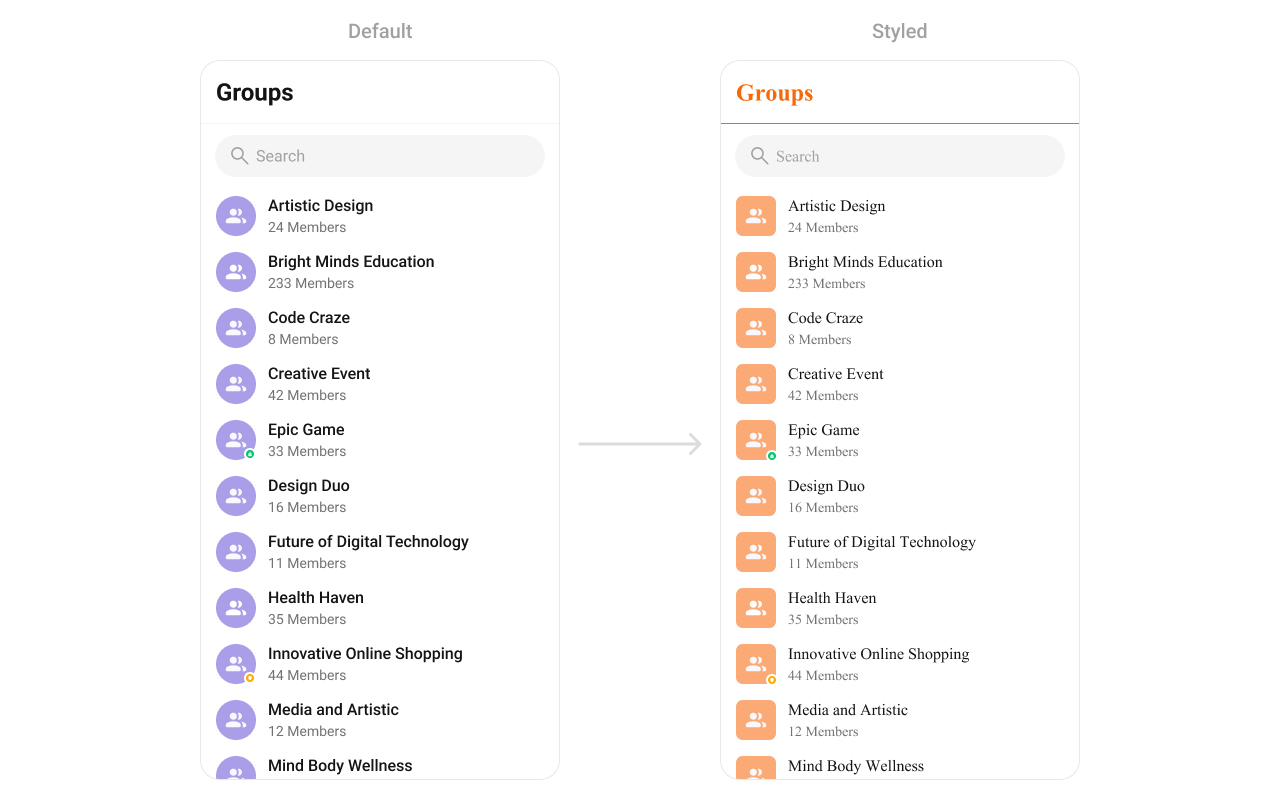 To fit your app’s design requirements, you can customize the appearance of the groups component. We provide exposed methods that allow you to modify the experience and behavior according to your specific needs.Style