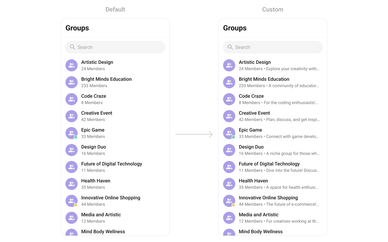 Assigns a fully custom ListItem layout to the Groups component, replacing the default design. Use Cases:- Add a description below the group name.